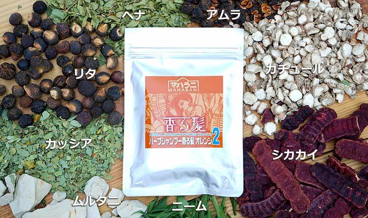 全成分(和名):アカシアコンシナ葉、アンマロク果実、ムクロジ果実、ヘンナ、バンウコン根、カッシアイタリカ葉、フラー土、アザジラクタインジカ(メリアアザジラクタ)葉、オレンジ油。